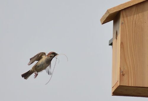 昨日のブログはスズメの「子づくり作業」の写真をアップしました それで今日はどうしてるか?と、朝から巣箱を見ると・・・ 一生懸命材料を運んでいました 材料って意外に細いのを使うんですね よっこらしょ!と巣箱の入口に到着 そしてまた飛んでいったと思…